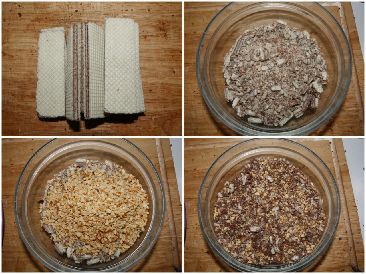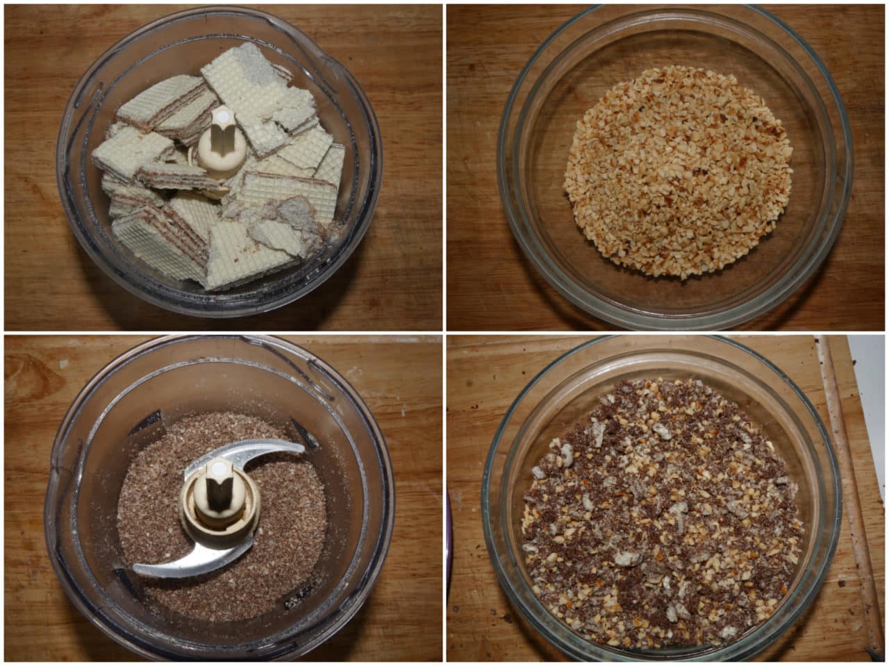 A parte, mettete i wafer in un mixer e frullate fino ad ottenere un composto sabbioso, quindi uniteli alla granella di nocciole.