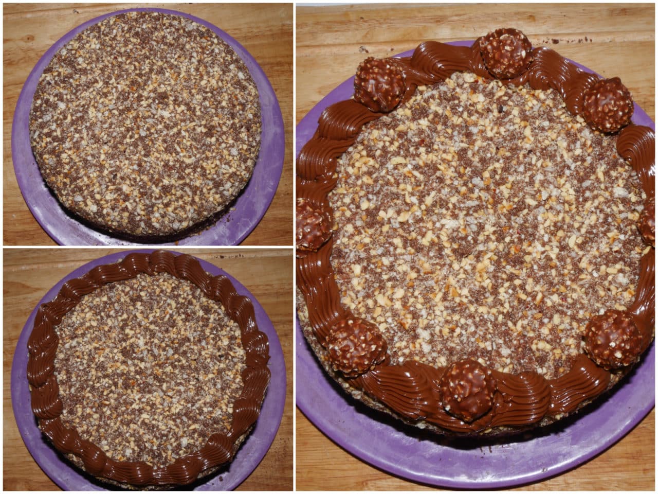 Usate il mix per ricoprire superficie e bordi della torta, facendo aderire il mix alla crema Rocher.