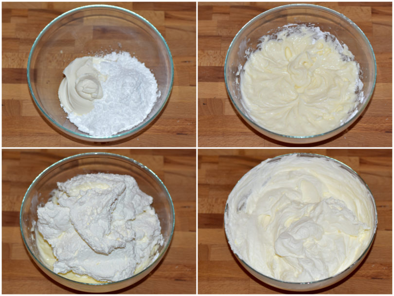 Montate la panna ben fredda di frigo e lasciatela da parte, quindi montate il mascarpone con lo zucchero, infine unite la panna al mascarpone mescolando delicatamente con un movimento dal basso verso l'alto.