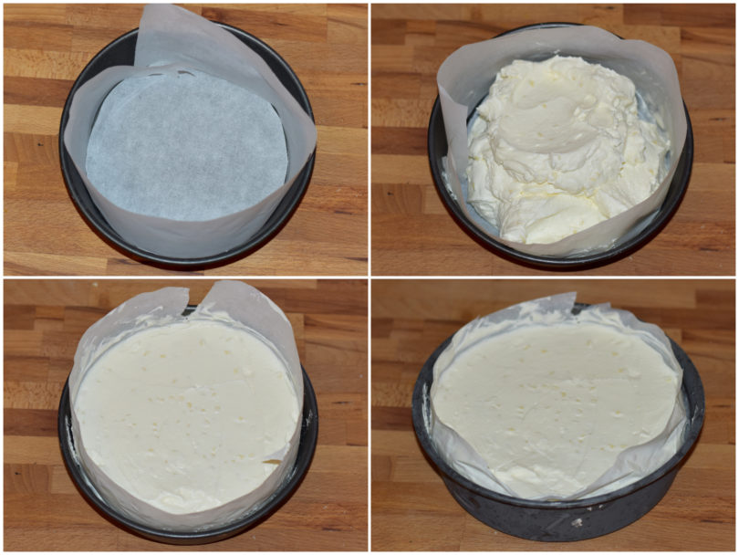 Versate il composto nello stampo rivestito di carta forno (o pellicola per alimenti) e livellate bene la superficie con una spatola per renderla più liscia possibile.