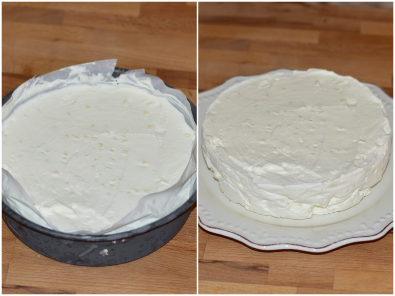 Passate le 6 ore riprendete la torta e sformatela delicatamente, eliminando anche la carta forno.