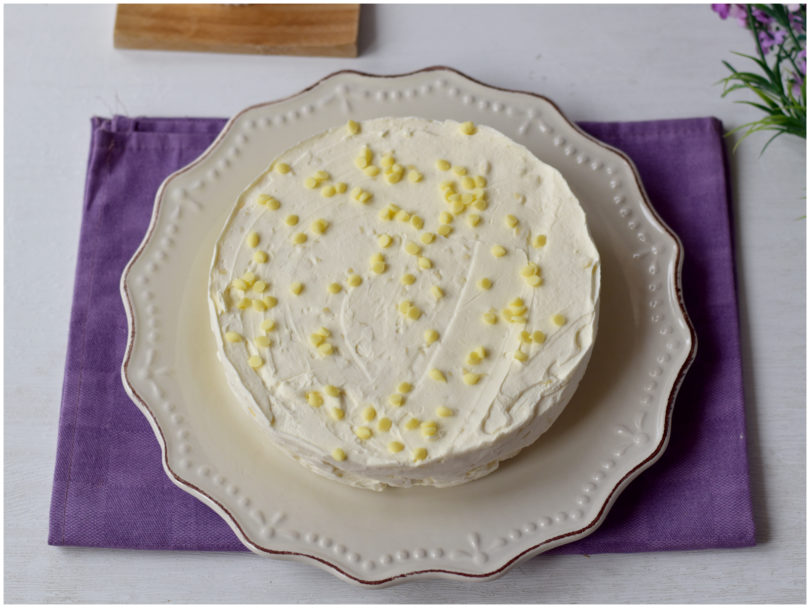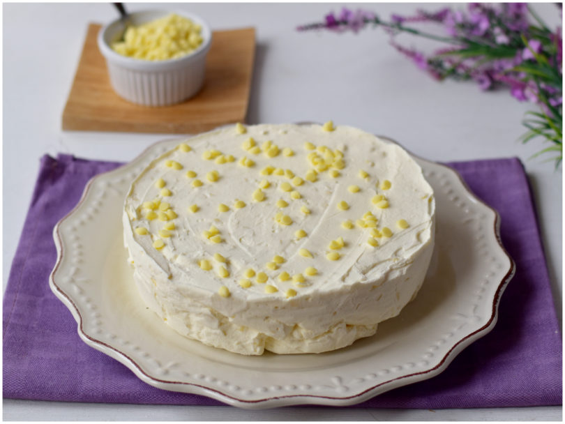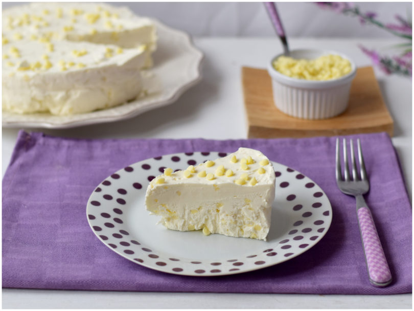 La torta fredda al cioccolato bianco è pronta, non vi resta che decorarla a piacere prima di servirla.