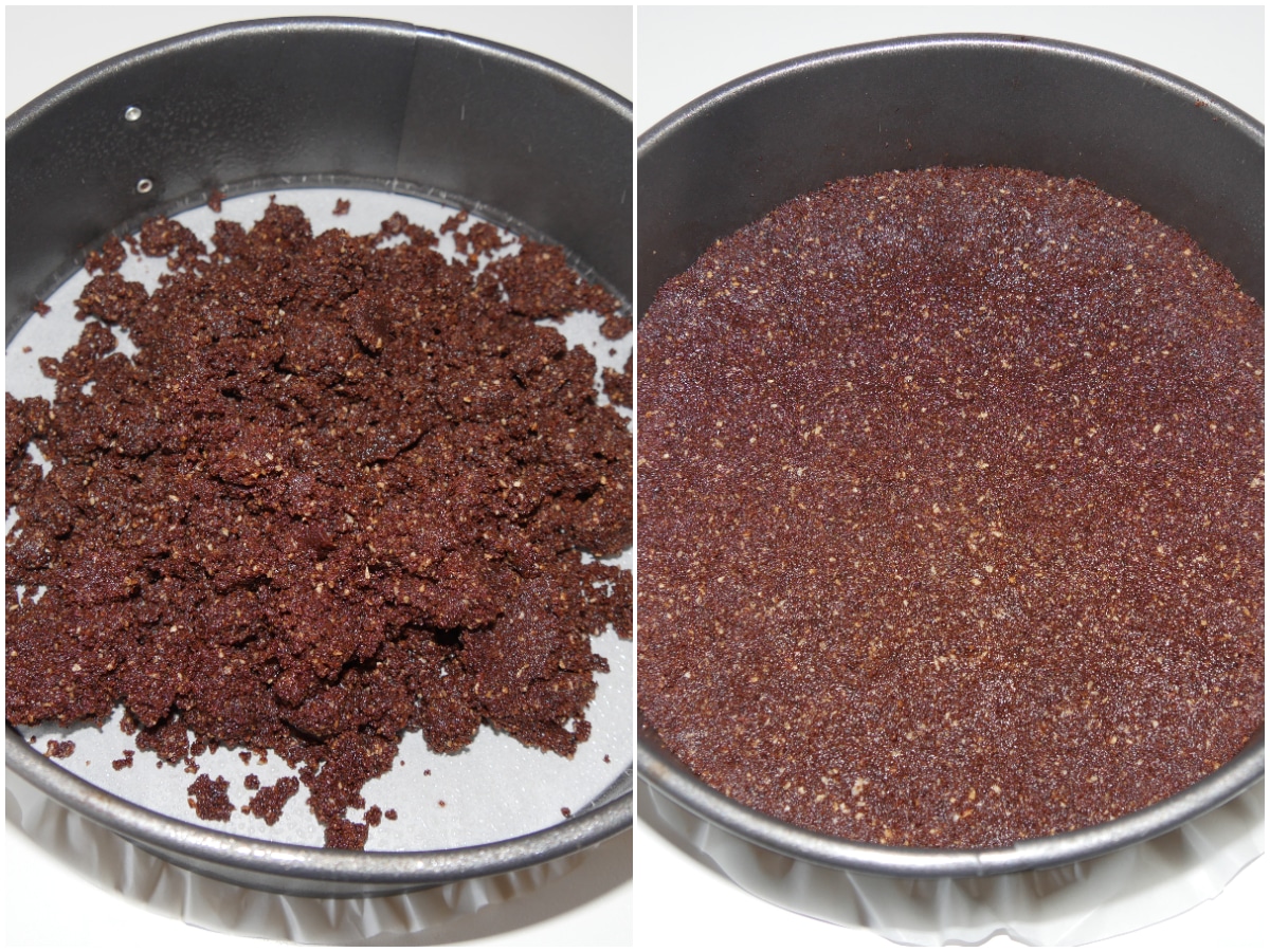 Trasferite il composto nello stampo (io ho aggiunto un cerchio di carta forno sul fondo, in modo da sformare la torta più facilmente prima di servirla) e compattate bene, creando uno strato uniforme su tutto il fondo, e mettete in frigo.