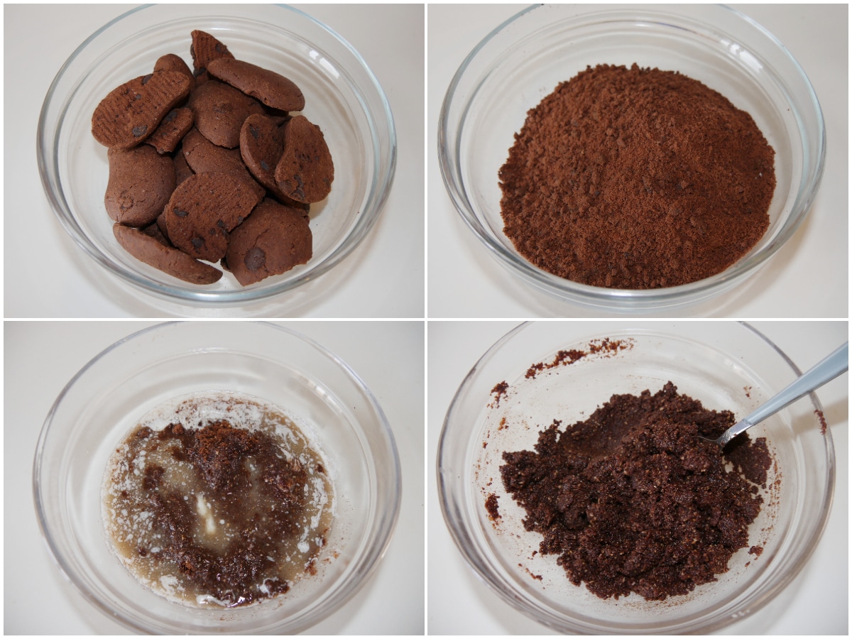 Innanzitutto tritate finemente i biscotti (va bene anche in un mixer) e mischiateli con il burro fuso.