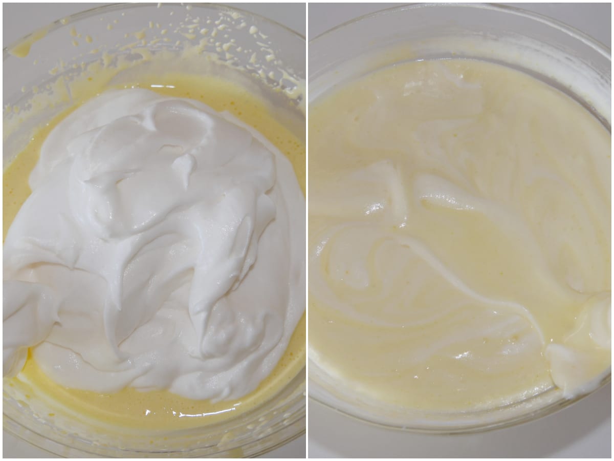 Unite quindi la panna allo zabaione, mescolando delicatamente con movimenti dal basso verso l'alto.