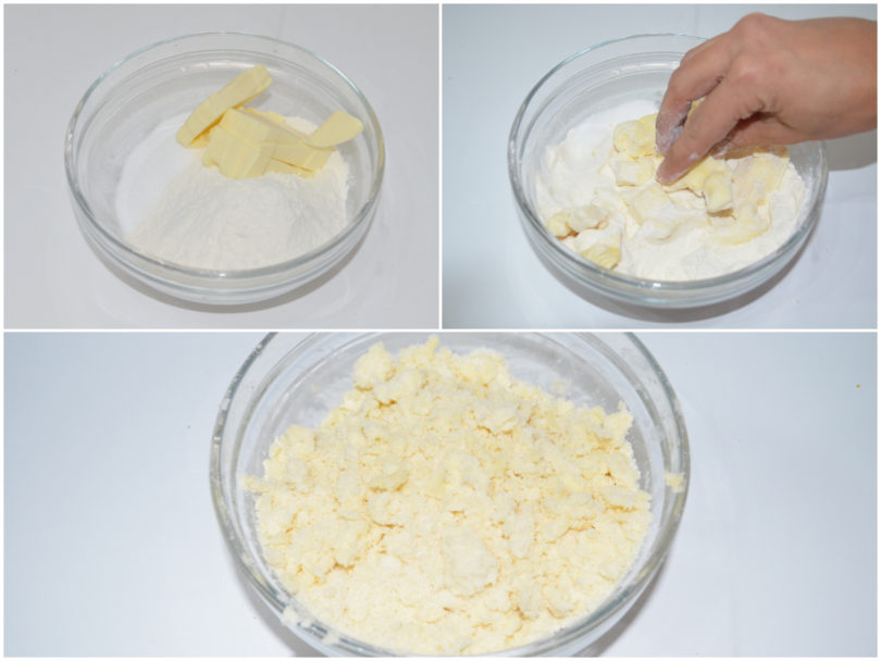 Innanzitutto preparate il crumble: impastate velocemente tutti gli ingredienti con le dita, quindi coprite con pellicola e fate riposare in frigo per almeno 30 minuti.