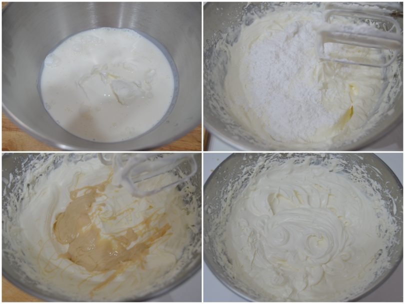 Nel frattempo montate il mascarpone con la panna ben fredda di frigo, quindi aggiungete prima lo zucchero e poi la crema Rossana.