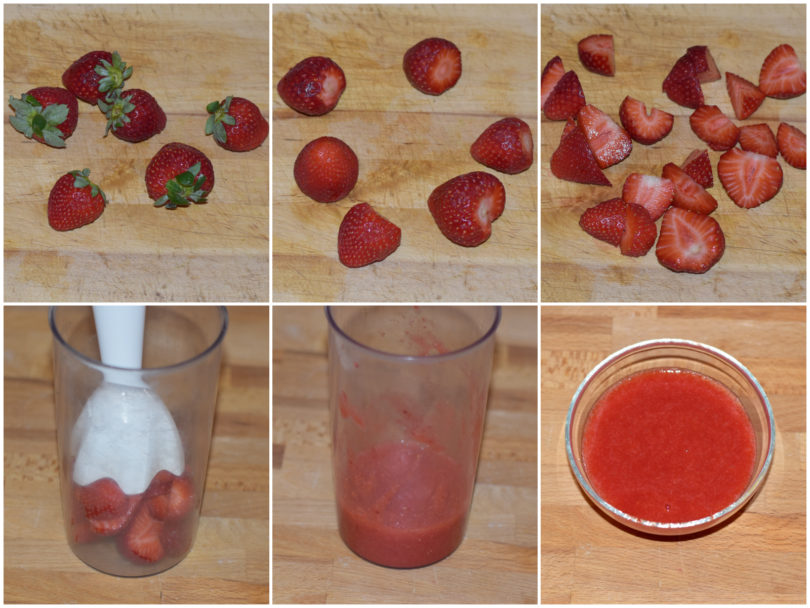 Per il gelato alla fragola: mondate le fragole, frullatele, filtratele e incorporatele alla seconda vaschetta da 300 gr insieme con il colorante, sempre mescolando delicatamente, poi rimettete in frigo.
