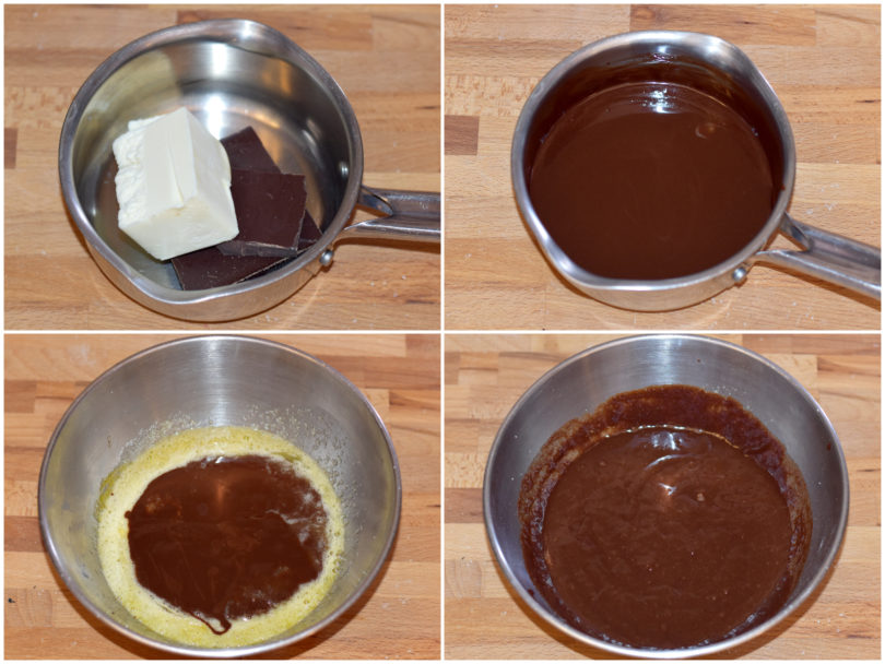 Innanzitutto preparate la base brownies: sbattete le uova con lo zucchero, poi incorporate burro e cioccolato precedentemente sciolti insieme (in microonde o a bagnomaria), infine incorporate farina, cacao e lievito setacciati.