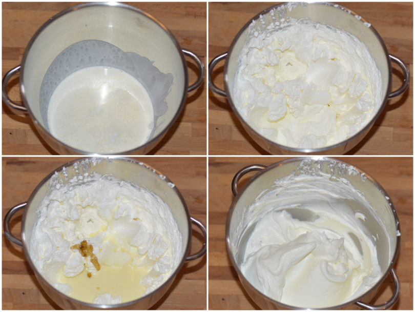 Preparate la base del gelato: montate la panna bene fredda di frigo, quindi incorporate latte condensato e vaniglia mescolando delicatamente con un movimento dal basso verso l'alto; dividete in 3 parti (1 da 400 gr e 2 da 300 gr) e lasciate riposare in frigo.