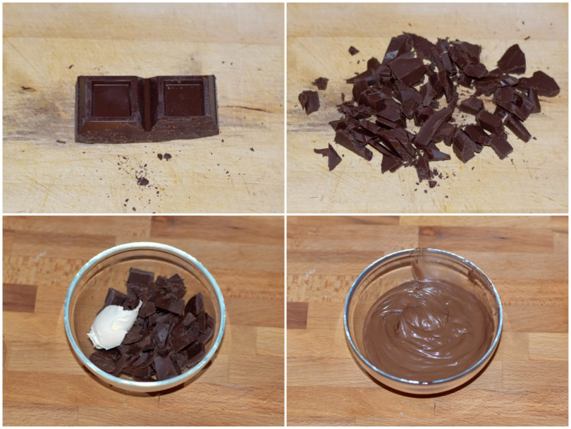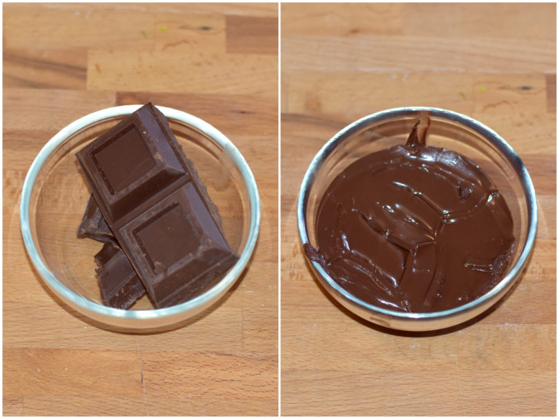 Spezzettate il cioccolato (i 150 gr) e scioglietelo in microonde o a bagnomaria.