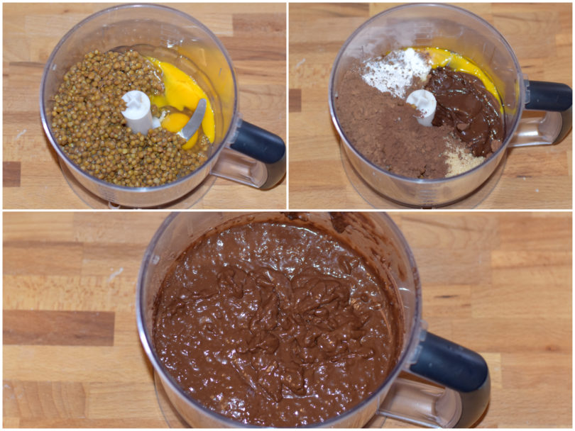 Unite in un mixer uova, lenticchie, lievito, cacao, zucchero e cioccolato e frullate fino ad ottenere un composto uniforme.