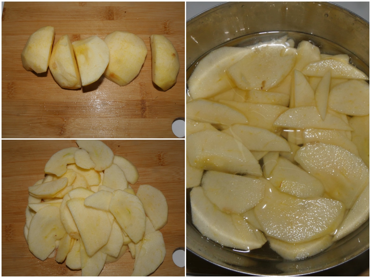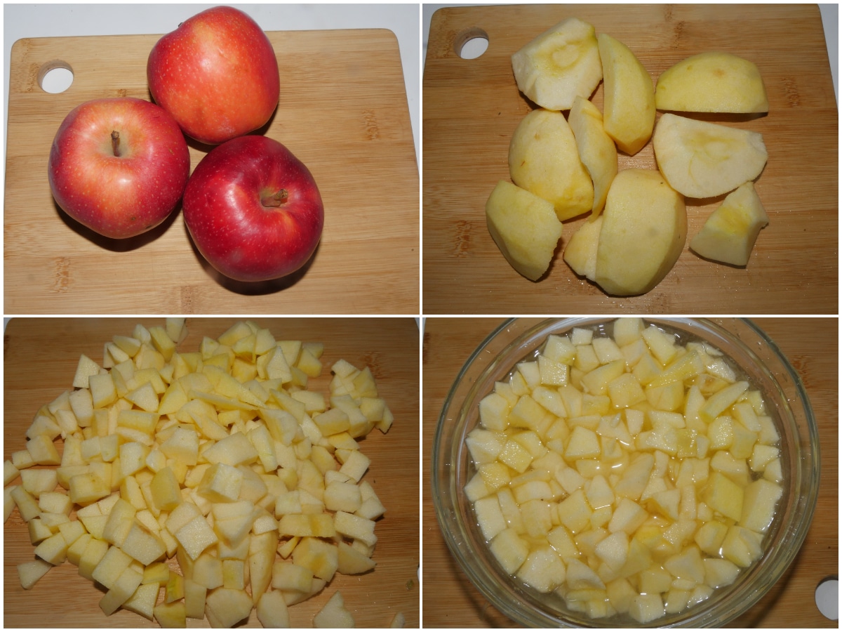 Innanzitutto sbucciate le mele e tagliatene 2 a cubetti e 1 a fettine, mettendole poi in 2 diverse ciotole (tenendo quindi separati i cubetti dalle fettine) con acqua e limone, così che non si ossidino.