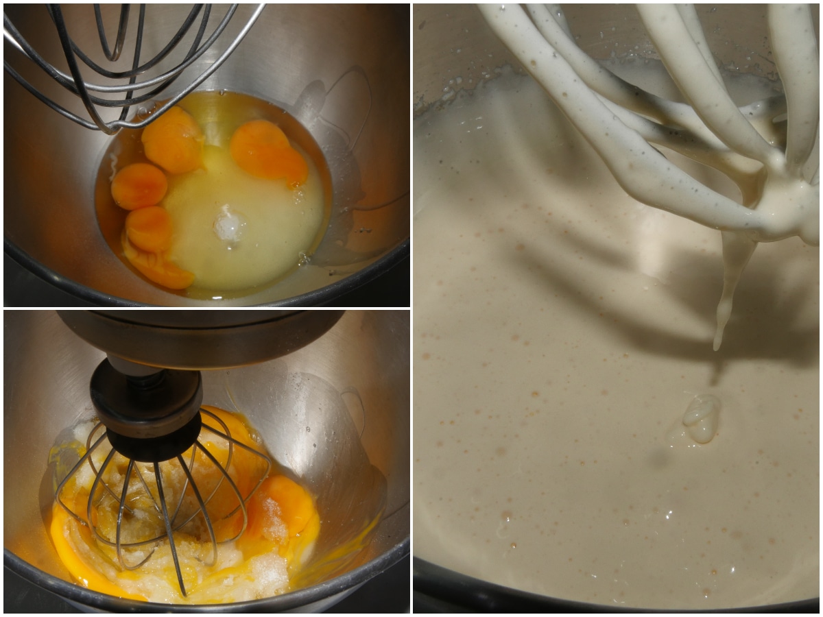 Montate le uova con lo zucchero per almeno 5-10 minuti, fino ad ottenere un composto gonfio e chiaro.
