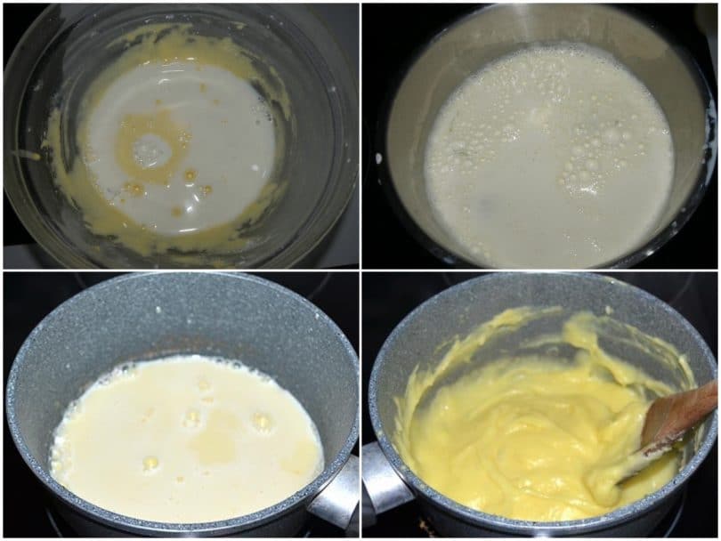 In ultimo aggiungete il latte a filo, mescolate, mettete in un pentolino e cuocete la crema pasticcera fino a farla addensare.