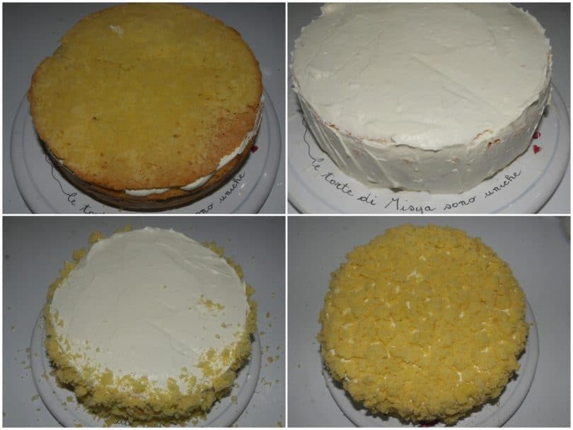 Decorate tutta la superficie della torta mimosa facendo aderire la mollica di Pan di Spagna.