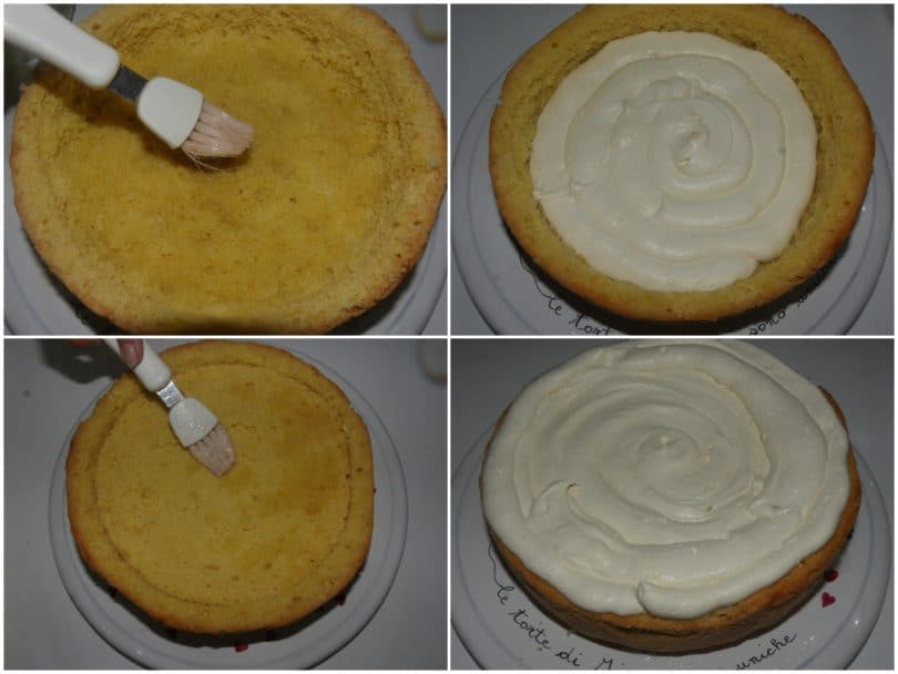Chiudete la torta con il cerchio asportato all'inizio, bagnandolo con un po' di sciropppo, quindi farcite con altra crema.