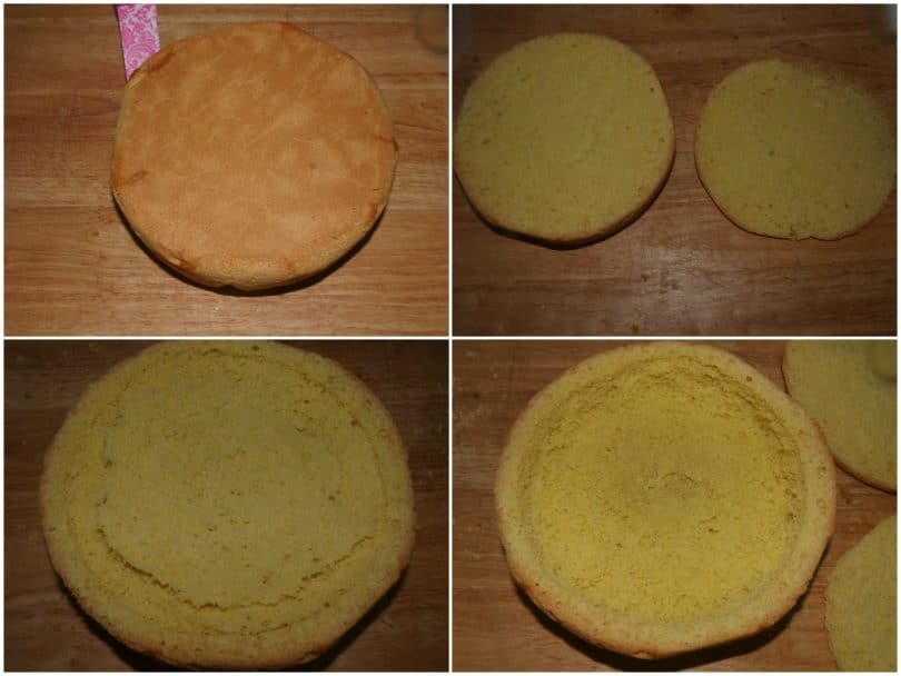 Tagliate orizzontalmente la parte superiore del pan di Spagna asportando la calotta. Poi tagliate un disco dall'interno incidendo internamente un cerchio ed asportandolo delicatamente.