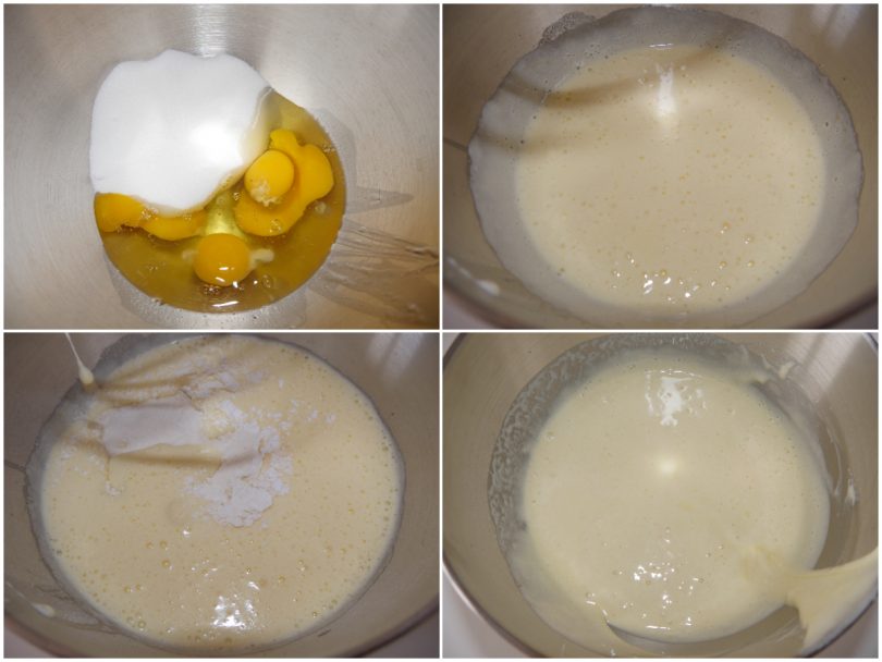 Montate le uova con lo zucchero fino a renderle chiare e spumose, poi incorporate olio, latte, vaniglia e farina e lievito setacciati.