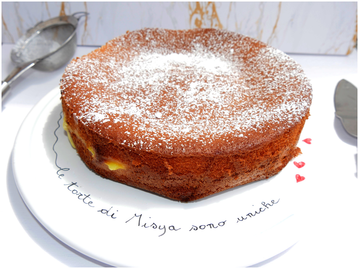 La torta morbida alla crema è pronta: decorate con zucchero a velo e servite.