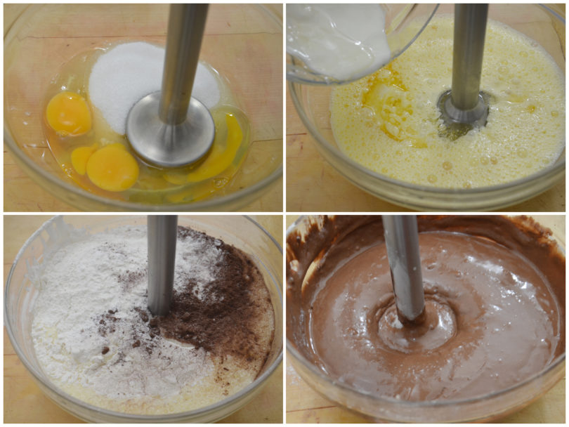 Aggiungete lo yogurt, l’olio di semi,poi il cacao amaro, la farina ed il lievito per dolci setacciati.
