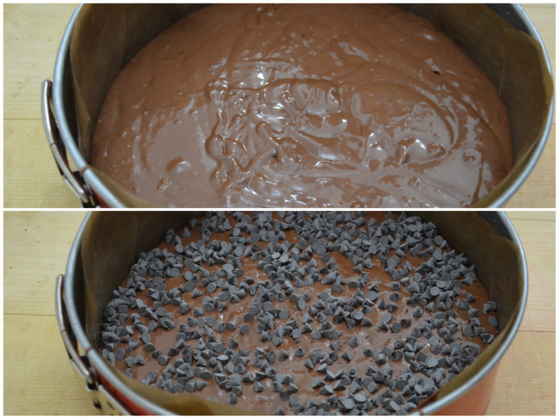Versate il composto in uno stampo imburrato ed infarinato, livellate il più possibile e ricoprite con le gocce di cioccolato.
