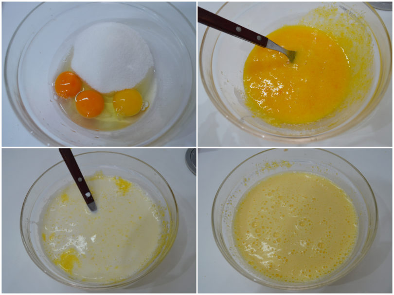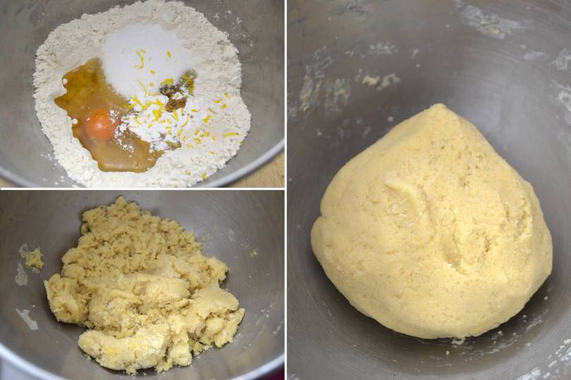 Innanzitutto preparate la pasta frolla: mettete farina e zucchero a fontana in una ciotola e versate al centro sale, buccia di limone, uova e burro a tocchetti.