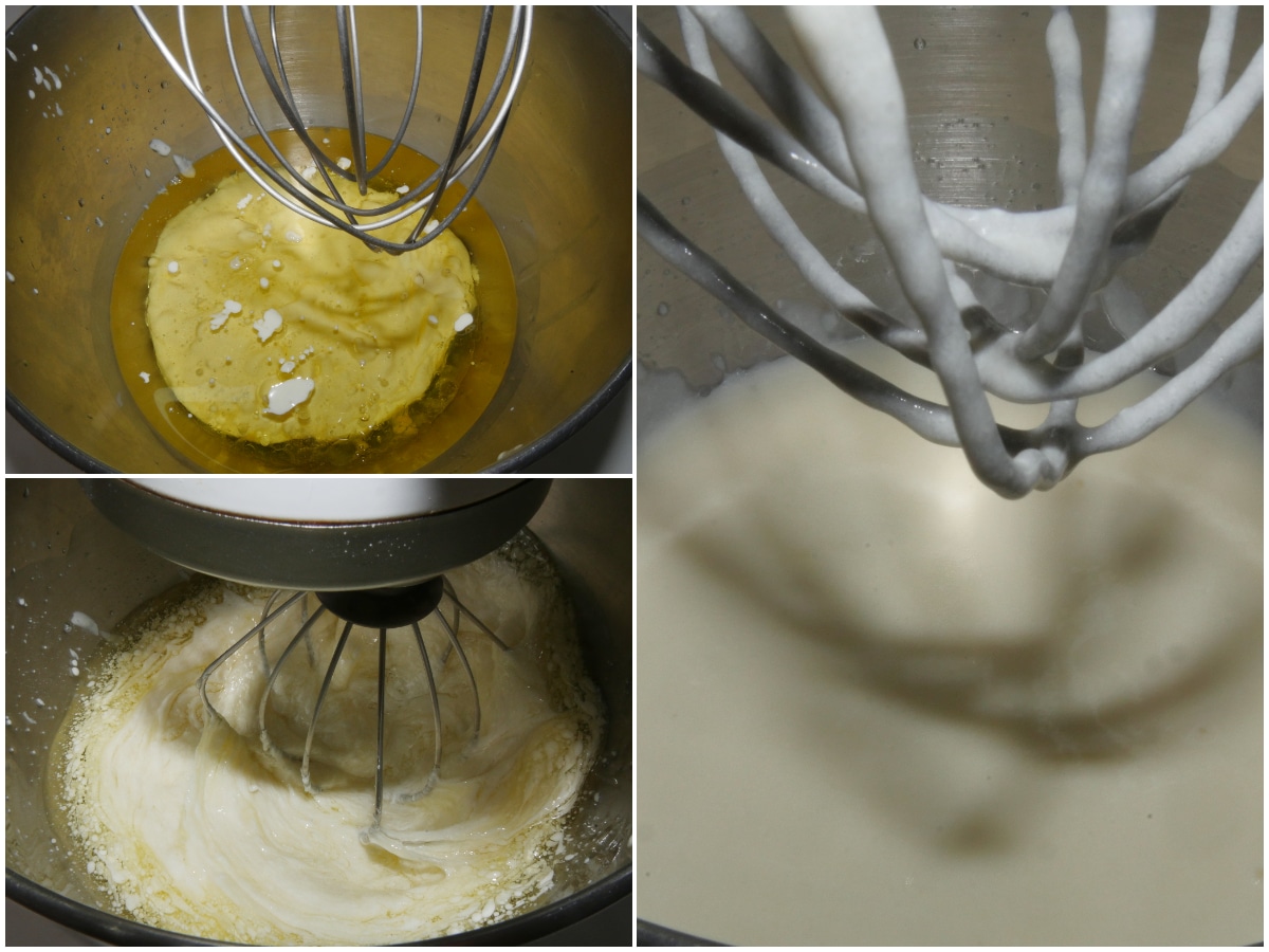 Montate i formaggi con lo zucchero a velo e, una volta ottenuta una crema omogenea, unite il cioccolato a filo (ancora caldo ma non più bollente: se avete un termometro per dolci dovrebbe essere intorno ai 40°C), continuando a montare, e infine anche il altte.