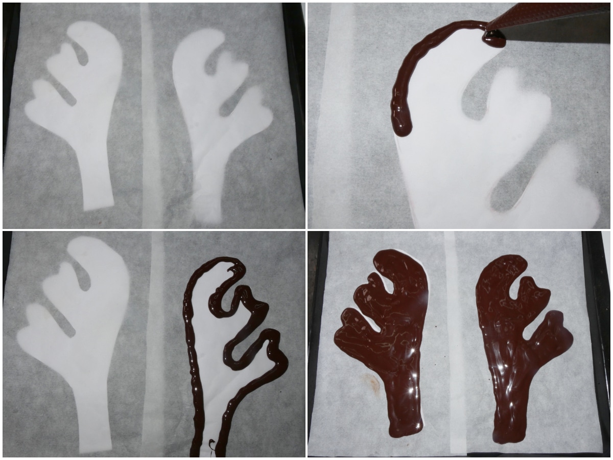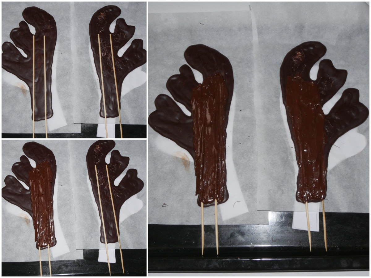 Finché il cioccolato è ancora umido, poggiate 2 spiedini di legno alla su ogni corno (in modo che ne seguano la lunghezza, perché dovranno sostenerne il peso), così che aderiscano al disegno, lasciate solidificare, quindi aggiungete un altro strato di cioccolato per cementare bene gli stecchini, infine lasciate asciugare completamente.