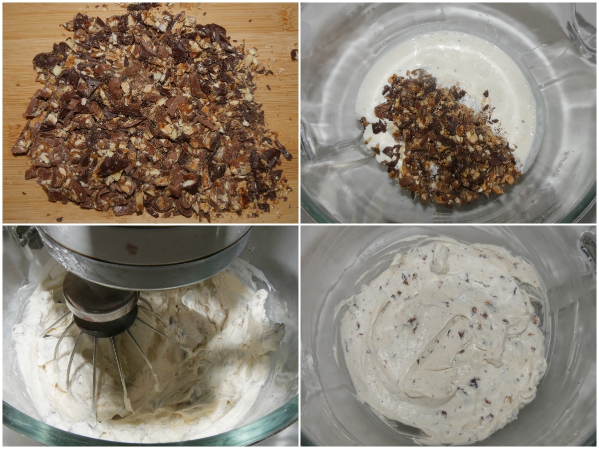 Preparate la crema al torroncino sbattendo con le fruste mascarpone, panna, zucchero a velo e torrone tritato (più o meno finemente, a seconda dei vostri gusti).