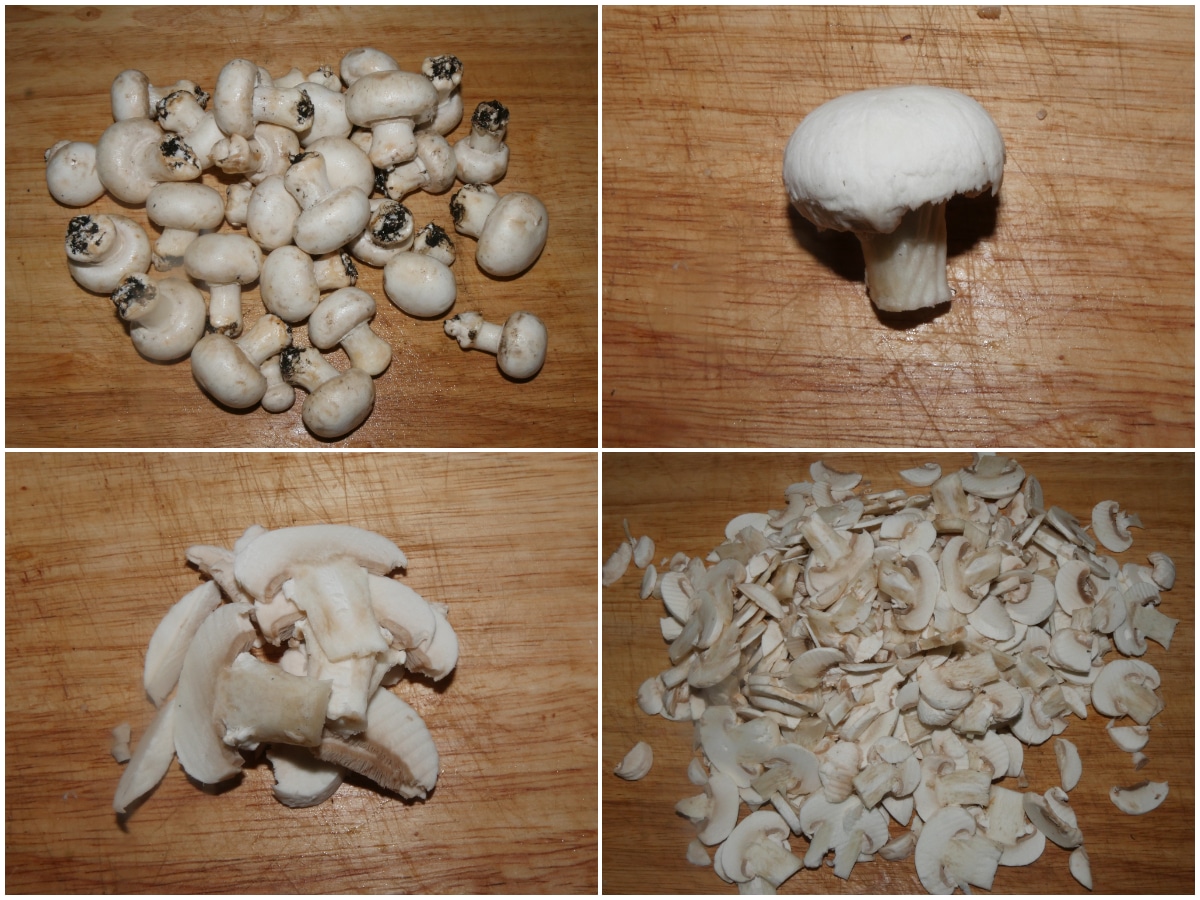 Pulire i funghi champignon con un panno umido, eliminare loro il gambo, e tagliarli a fette
