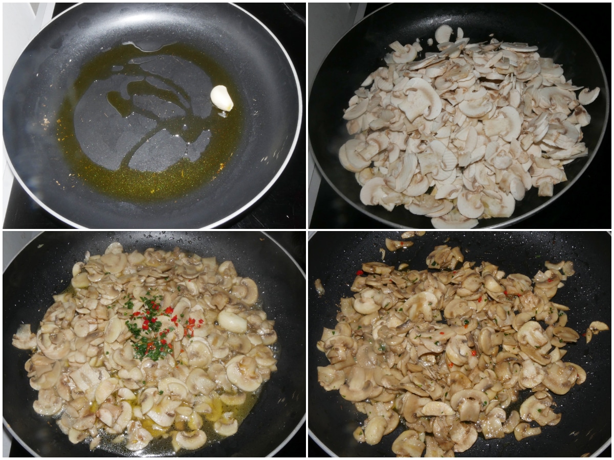 Far soffriggere uno spicchio d'aglio in un'ampia padella, aggiungere i funghi, condirli e far cuocere a fuoco moderato per 15 minuti circa