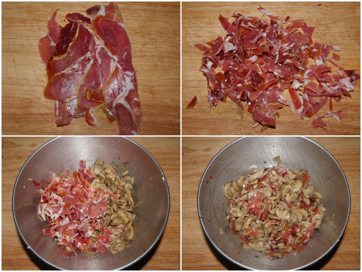 Mettete i funghi da parte in una ciotola con gli straccetti di prosciutto crudo