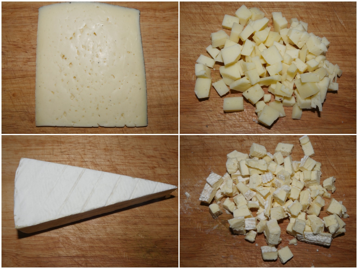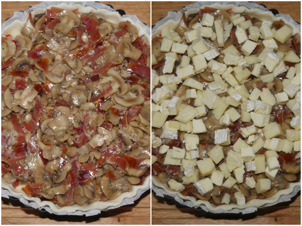 Ricoprire con i funghi trifolati e il prosciutto crudo.Tagliare i formaggi a cubetti e disporli su tutta la superficie del rustico,