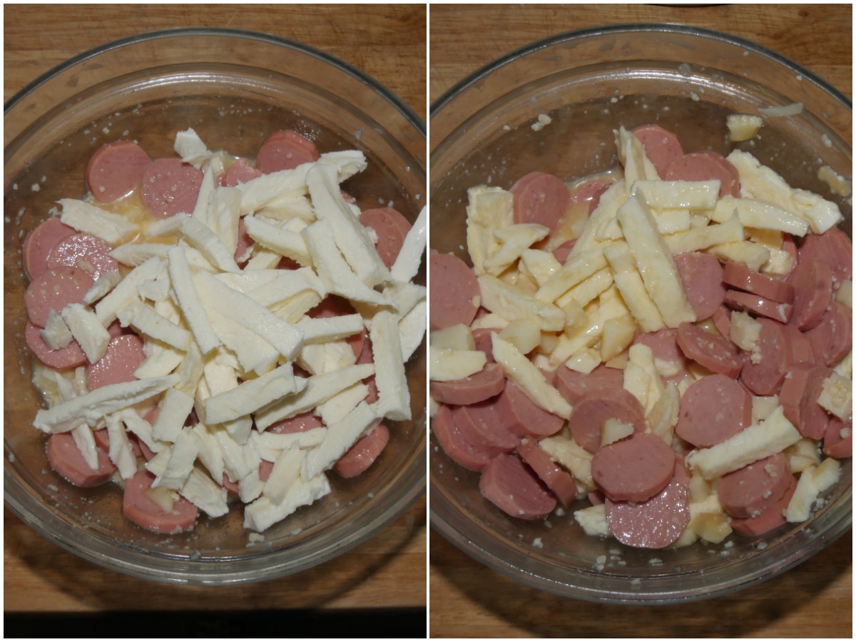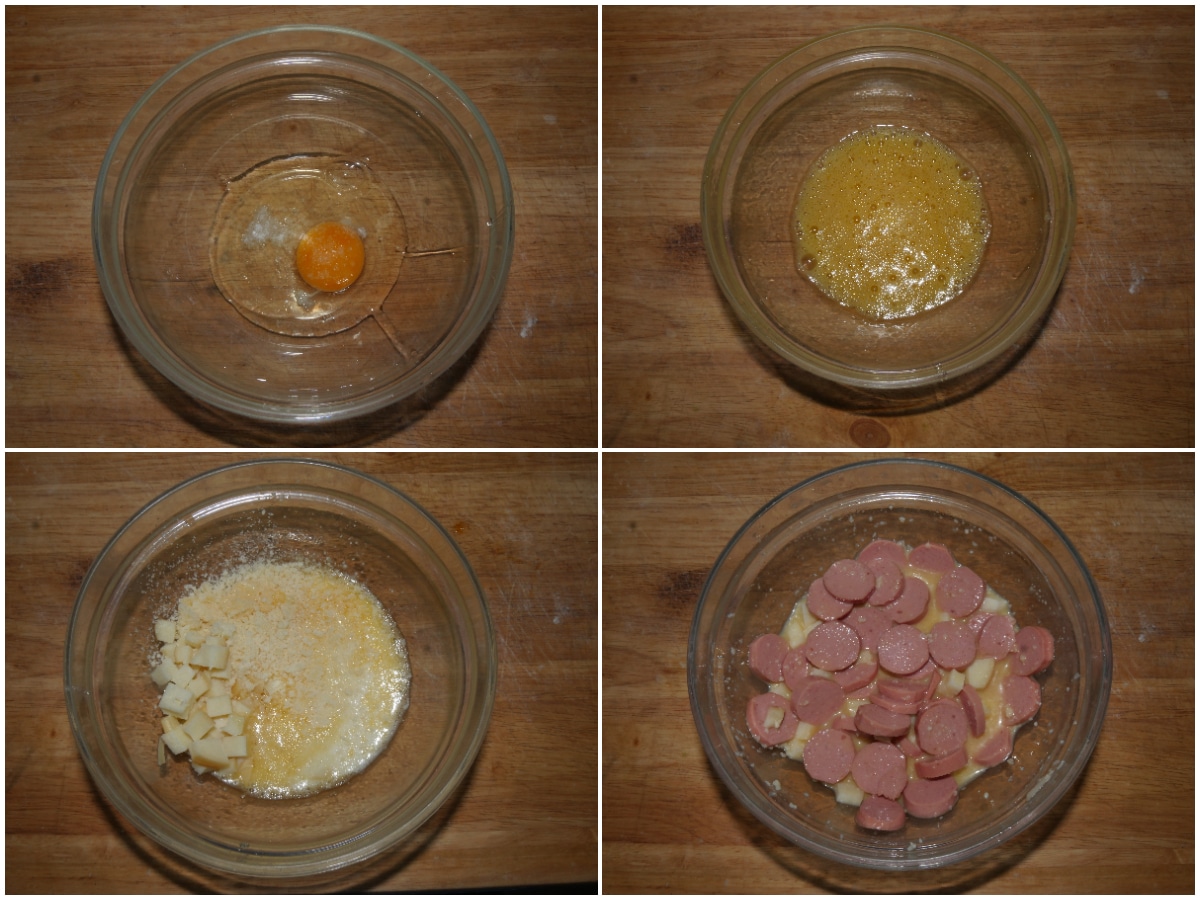 Sbattete le uova con un pizzico di sale e 2/3 del parmigiano, poi aggiungete scamorza e wurstel.