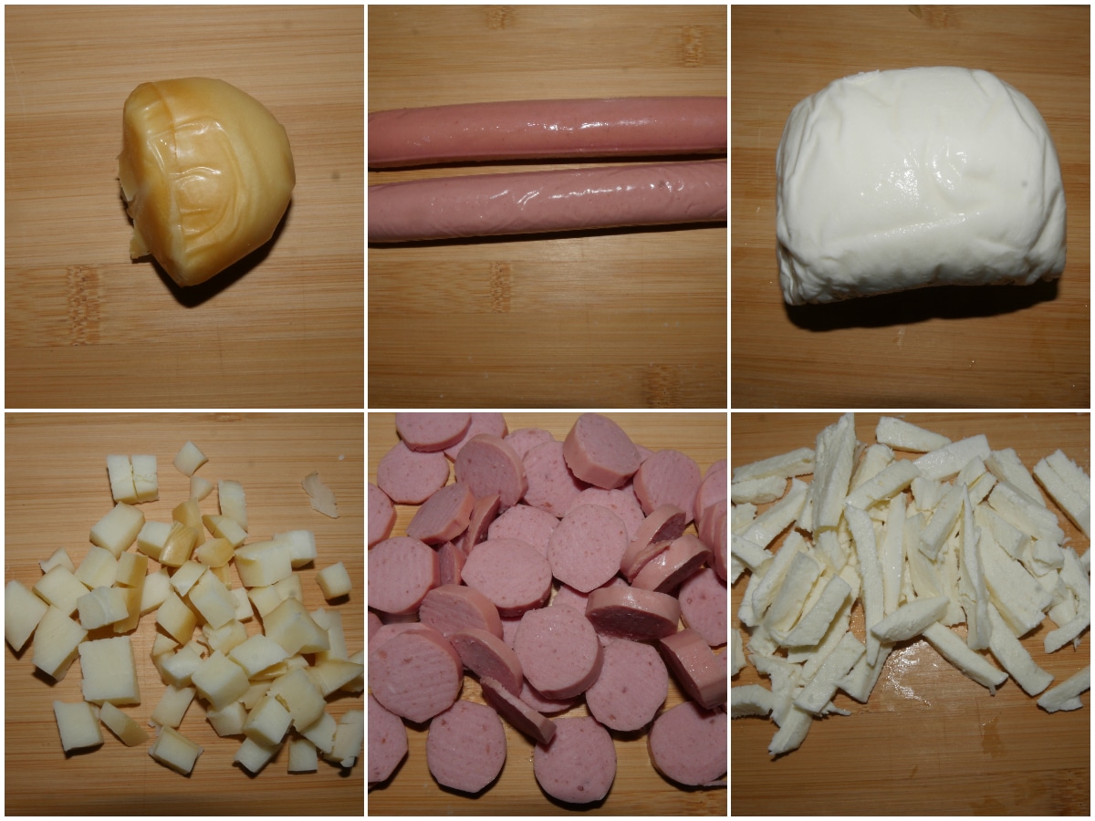 Preparate il ripieno: tagliate la scamorza a cubetti, i wurstel a rondelle e il fior di latte a listarelle.