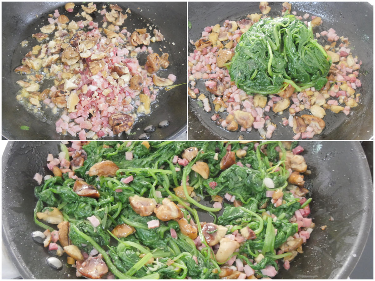 Una volta pronte sia le bietole che le castagne, procedete con la preparazione della torta salata: fate rosolare speck a dadini e castagne spezzettate in una padella antiaderente, quindi aggiungete anche le bietole (dopo averle strizzate delicatamente) e fate insaporire.