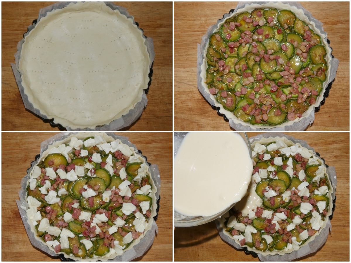 Rivestire una pirofila da forno con la pasta sfoglia e disporre al suo interno le zucchine e la pancetta.Aggiungere la mozzarella tagliata a dadini.