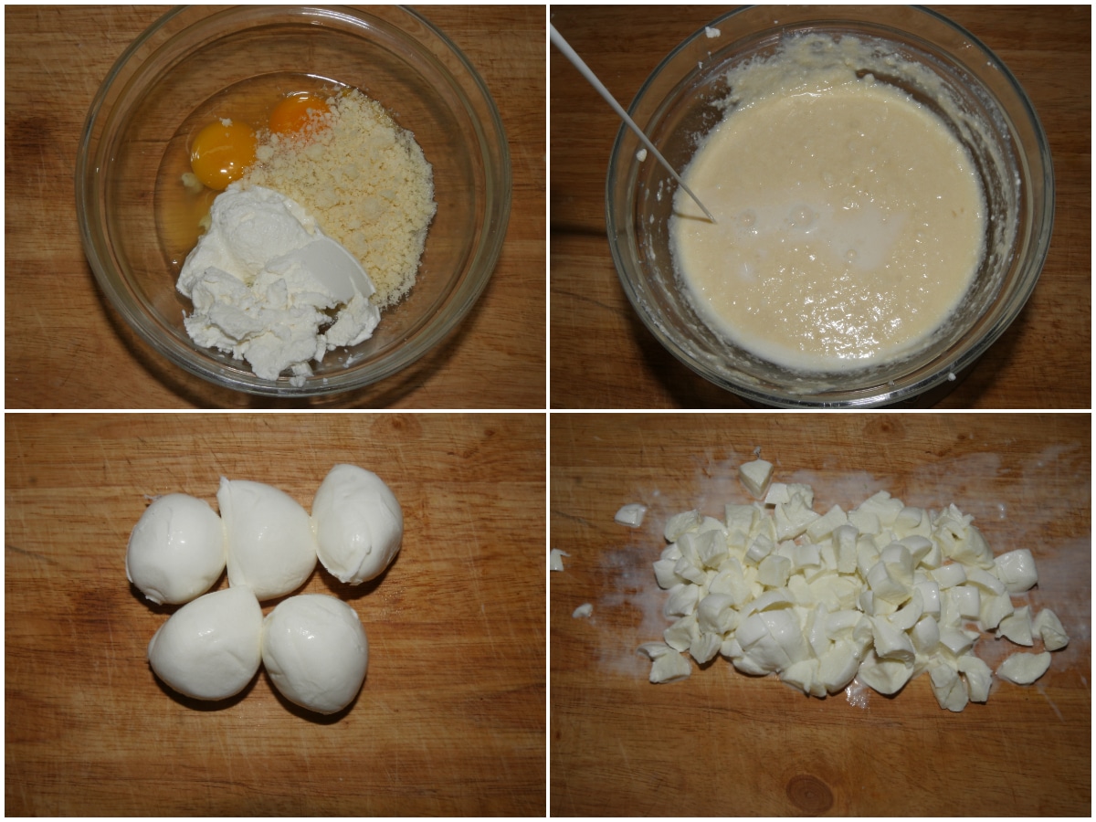 In una terrina mescolare le uova con la ricotta, il parmigiano, un pizzico di sale e pepe a piacere. Aggiungere il latte e mescolare fino ad avere un composto omogeneo. A parte tagliate la mozzarella a dadini.