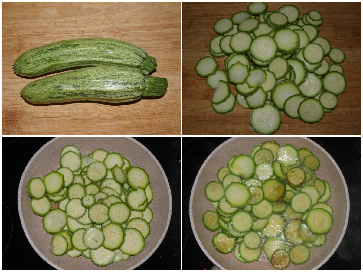 Spuntare le zucchine e tagliarle a rondelle sottili. Fatele appassire in padella con un filo d'olio sale e pepe.