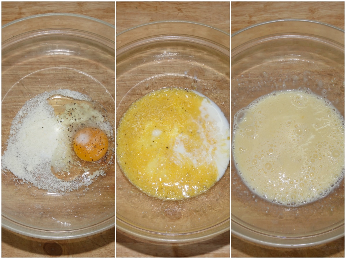 Sbattete l'uovo con parmigiano, sale e pepe, poi aggiungete il latte e mettete da parte 2-3 cucchiai di composto (li userete per spennellare i bordi della sfoglia).