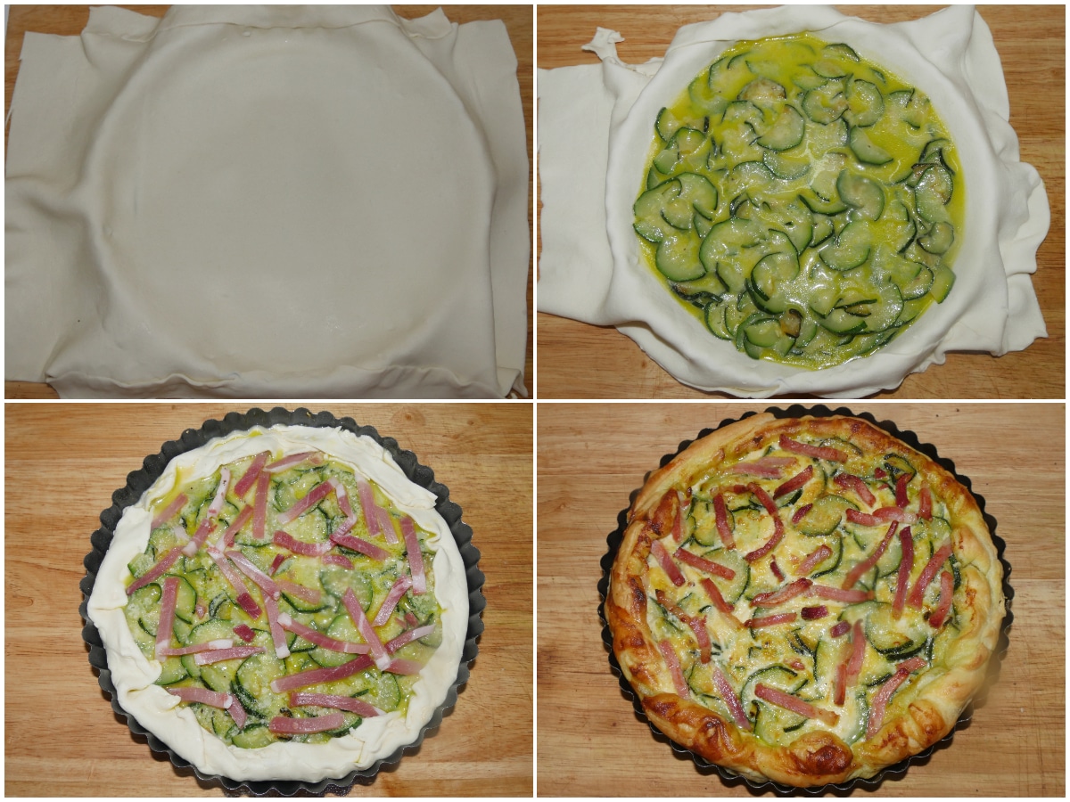 Foderate lo stampo imburrato con la pasta sfoglia (io avevo quella rettangolare e ho dovuto tagliare vi i bordi, se userete quella tonda non ce ne sarà bisogno), riempitela con la farcitura di zucchine e aggiungete lo speck.