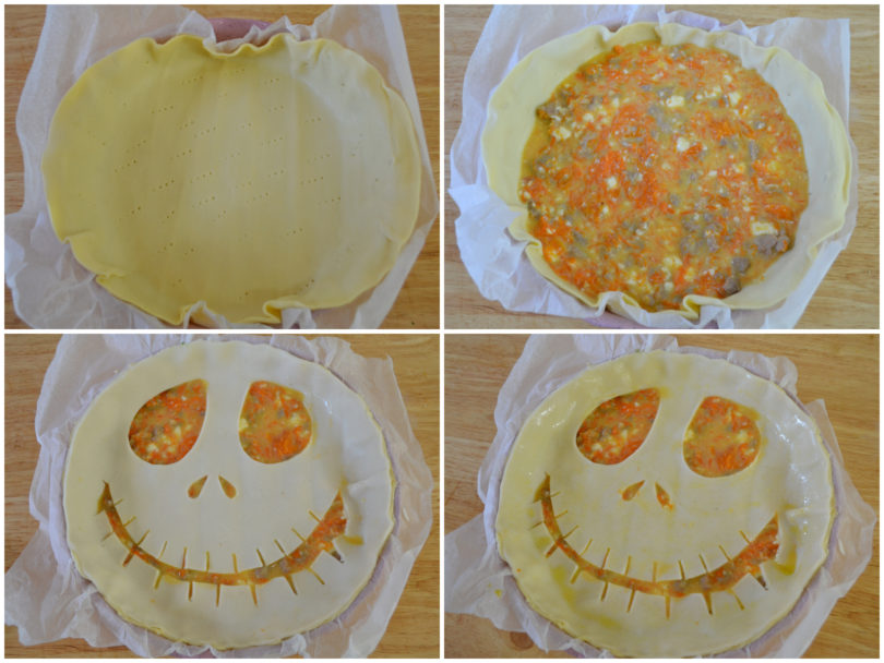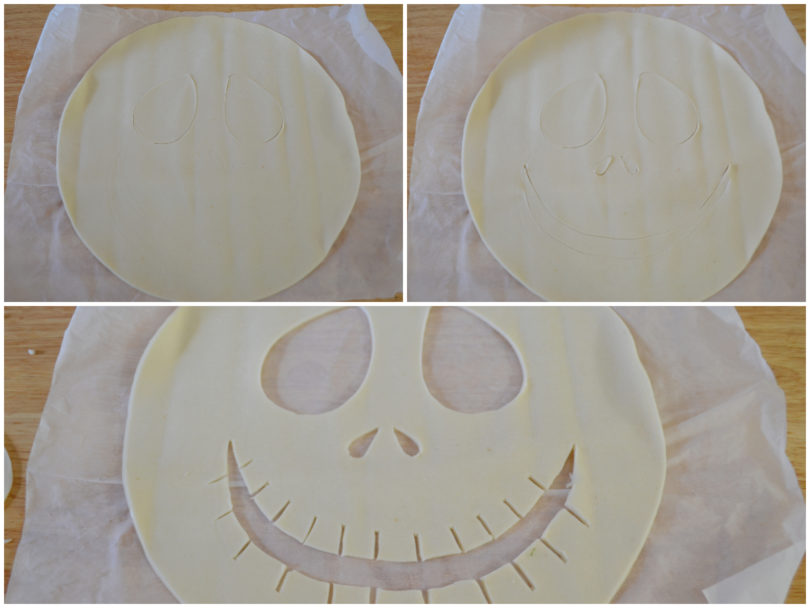 Ritagliate 2 dischi di pasta sfoglia: il primo leggermente più grande del diametro dello stampo da sistemare sul fondo e sui lati dello stampo imburrato. Il secondo disco dovrà invece avere lo stesso diametro dello stampo: ritagliate 2 tondi per fare gli occhi dello scheletro, due buchini per il naso e una mezzaluna per la bocca, così come da foto.