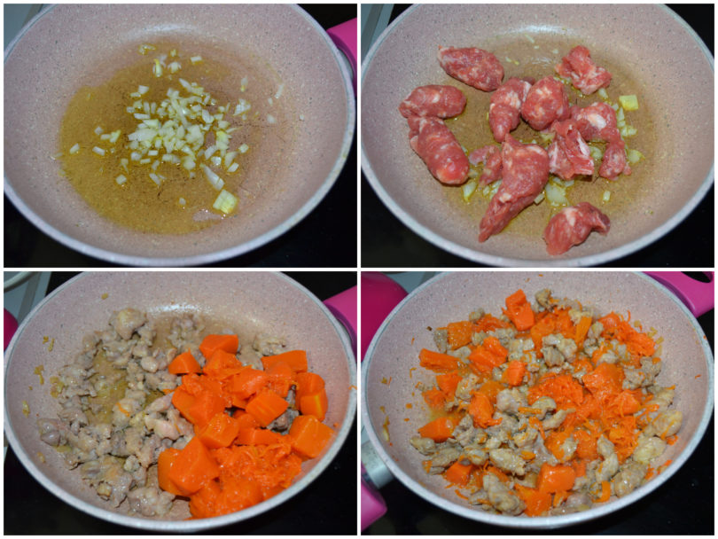 Sminuzzate lo scalogno e fatelo rosolare in una pentola, aggiungeteci poi la salsiccia a tocchetti e fatela saltare.