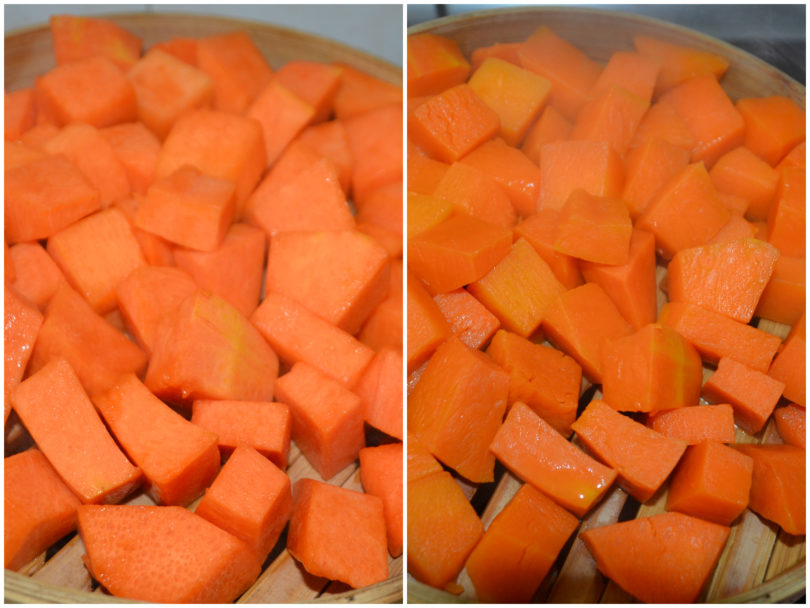 Schiacciate la zucca che avete precedentemente cotto al forno o al vapore e mettetela in una ciotola.