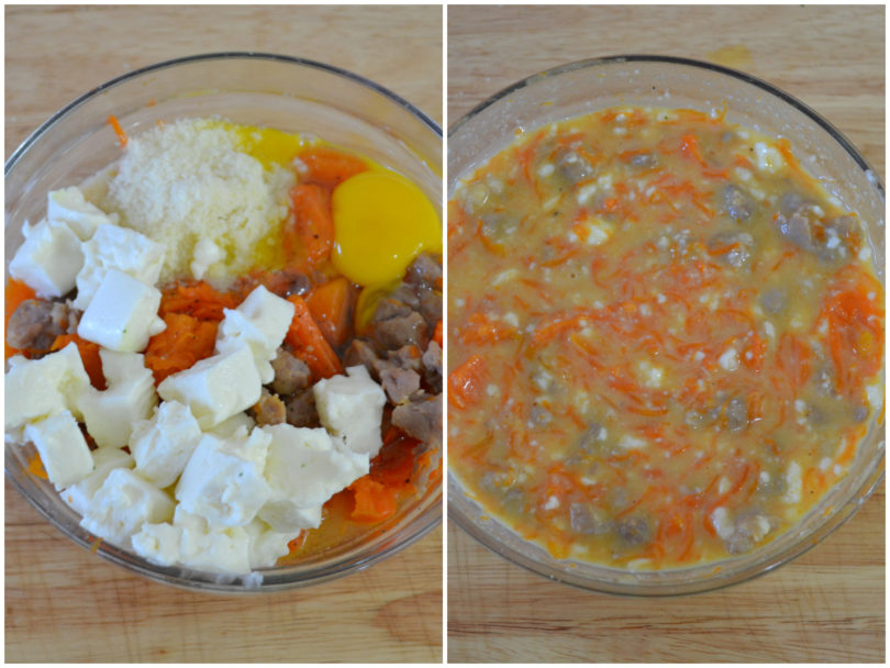 Spegnete il fuoco e fate raffreddare un po’. Nel frattempo sbattete le due uova intere con il formaggio e un pizzico di sale.