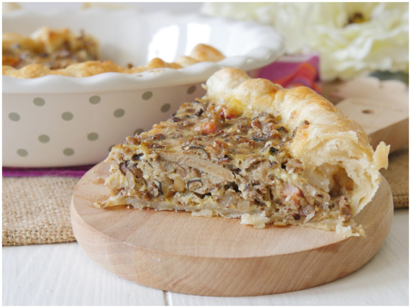 Lasciate intiepidire prima di estrarla dalla teglia e poi servite la vostra torta salata funghi e lenticchie.