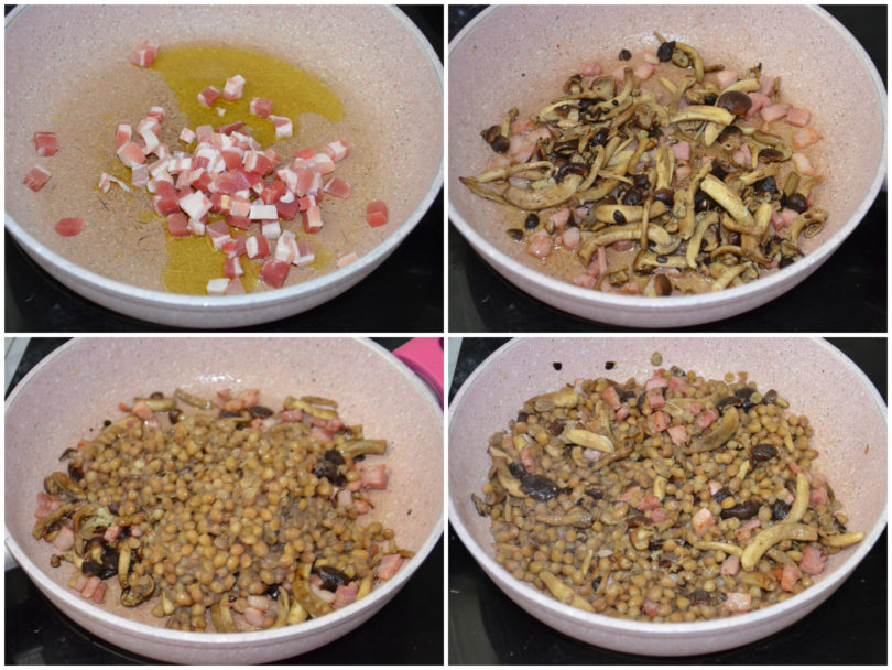 Rosolate la pancetta tagliata a dadini cuocendo per 3-4 minuti, poi aggiungete i i funghi. e fate insaporire. Poi unite anche le lenticchie bollite, salate e cuocete ancora per qualche minuto.