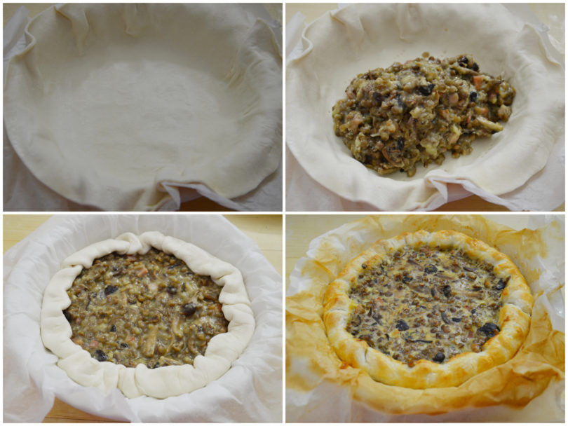 Versate il composto di funghi e lenticchie all’interno della tortiera, poi ripiegate i bordi della sfoglia fino ad ottenere un cordoncino.