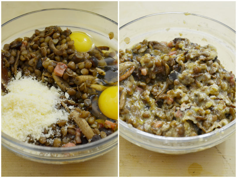 Mettete funghi, pancetta e lenticchie in una ciotola, poi unite le uova, il parmigiano e mescolate fino ad ottenere un composto omogeneo